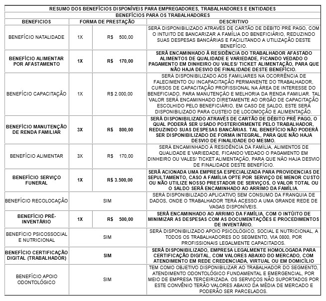 Parágrafo Décimo Primeiro: O empregado que optar por não contribuir ( que apresentar Carta de Oposição), está ciente que não fará jus aos benefícios ora conquistados pela atuação Sindical previstos nesta Convenção: ADIANTAMENTO SALARIAL, AUXÍLIO FUNERAL, HOMOLOGAÇÃO DE RESCISÃO DO CONTRATO DE TRABALHO COM ASSISTENCIA GRATUITA DO SINDICATO , ESTABILIDADE DE FÉRIAS, ESTABILIDADE PROVISÓRIA GESTANTE DE 60 DIAS, ESTABILIDADE PROVISÓRIA APOSENTADORIA, ACORDO EXTRAJUDICIAL COM ASSESSORIA JURÍDICA DO SINDICATO , e outras ASSESSORIAS pelo SINDICATO , assim como, CONVÊNIOS CORPORATIVOS e PARCERIAS firmadas entre o SINDICATO : Faculdades, Universidades, Escolas de Idiomas, Cursos Técnicos, Colônias de Férias, Consultas e exames Médicos, Lazer entre outras parcerias, que a COTA DE PARTICIPAÇÃO NEGOCIAL viabiliza a existência e manutenção.